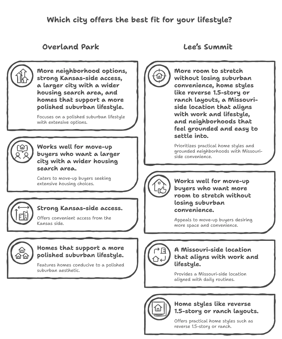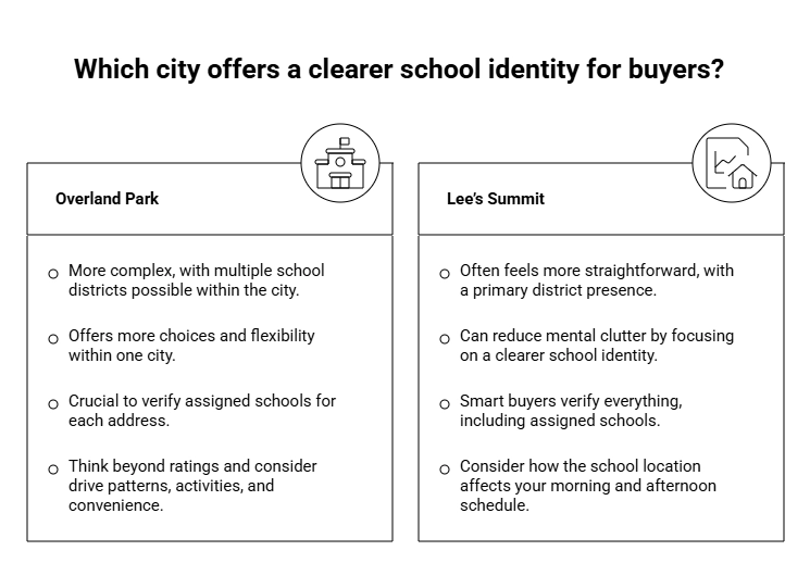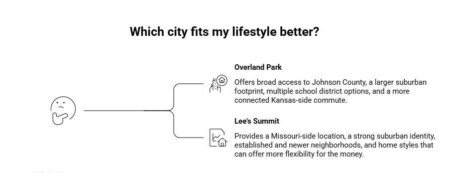 Relocators should weigh taxes, schools, and lifestyle: Overland Park (KS) offers strong schools, newer developments, and easy access to JoCo amenities, while Lee's Summit (MO) offers a scenic, family-friendly environment with lower upfront home prices in some neighborhoods and access to Longview Lake. Consider differences in state taxes (KS vs MO), school districts (Blue Valley and Shawnee Mission near OP, Lee's Summit R-7 in LS), and commute routes (I-435, I-470) when deciding which burb fits your needs.