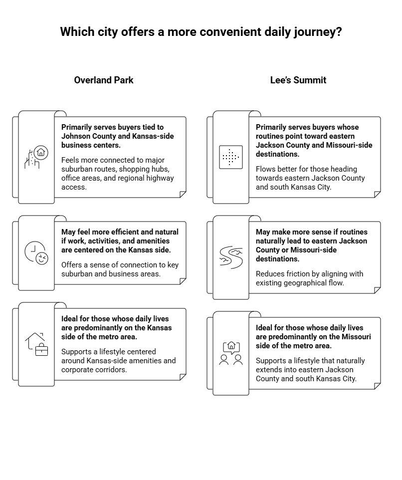 Commute times depend on where you work in the Kansas City metro. Overland Park is north of 435 with direct access to 435 and 69, making it convenient for jobs in south KC and JoCo; Lee's Summit sits on the Missouri side (816 area) with good access to I-470 and US-50. Rush hour patterns vary: OP may have heavier traffic on 435 and 69, while LS commuters face congestion toward downtown KC or KCMO; both offer park-and-ride and transit options, but driving is common.